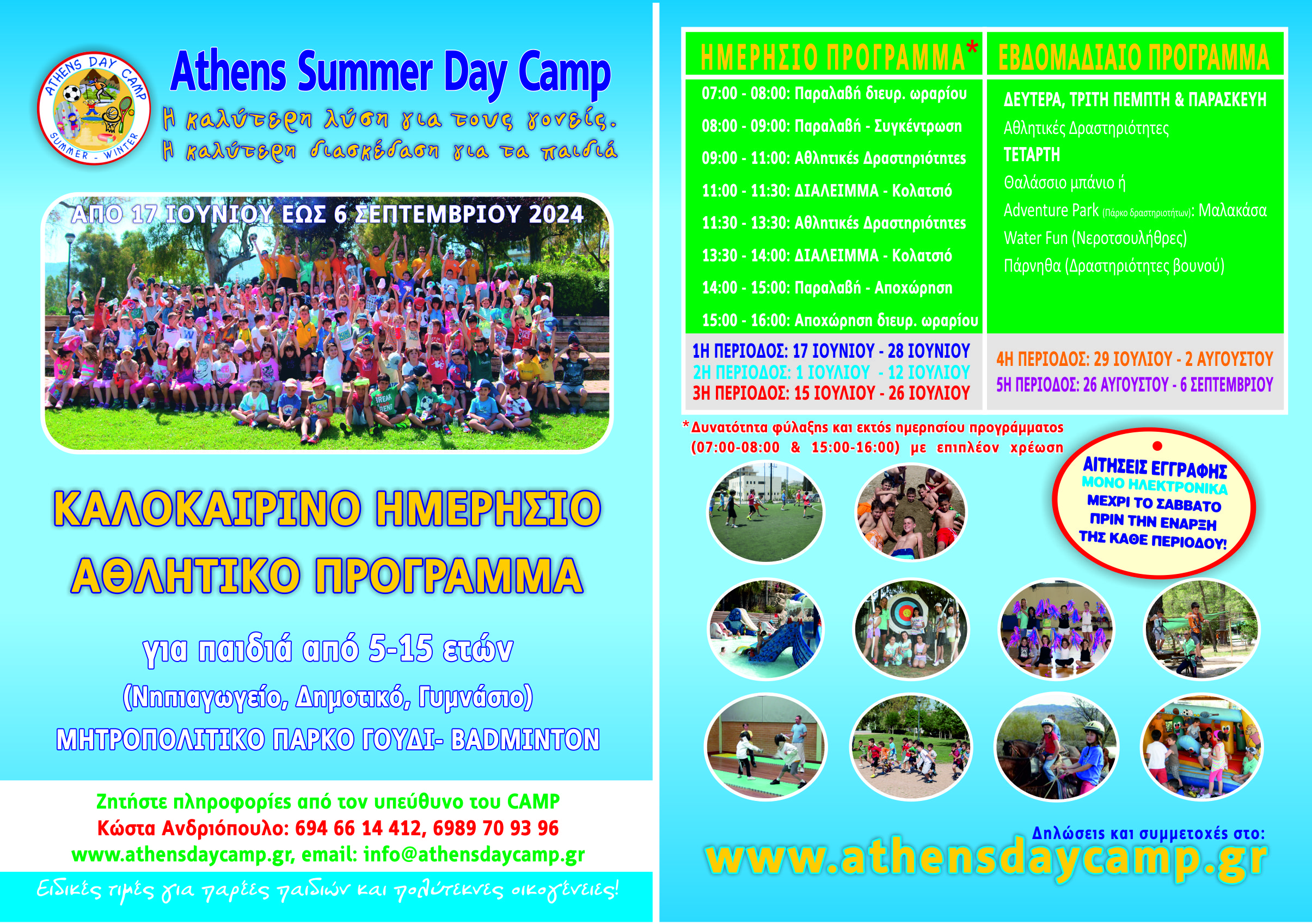 - Για εγγραφή ακολουθήστε τον σύνδεσμο: Athens day camp στο Γουδί,