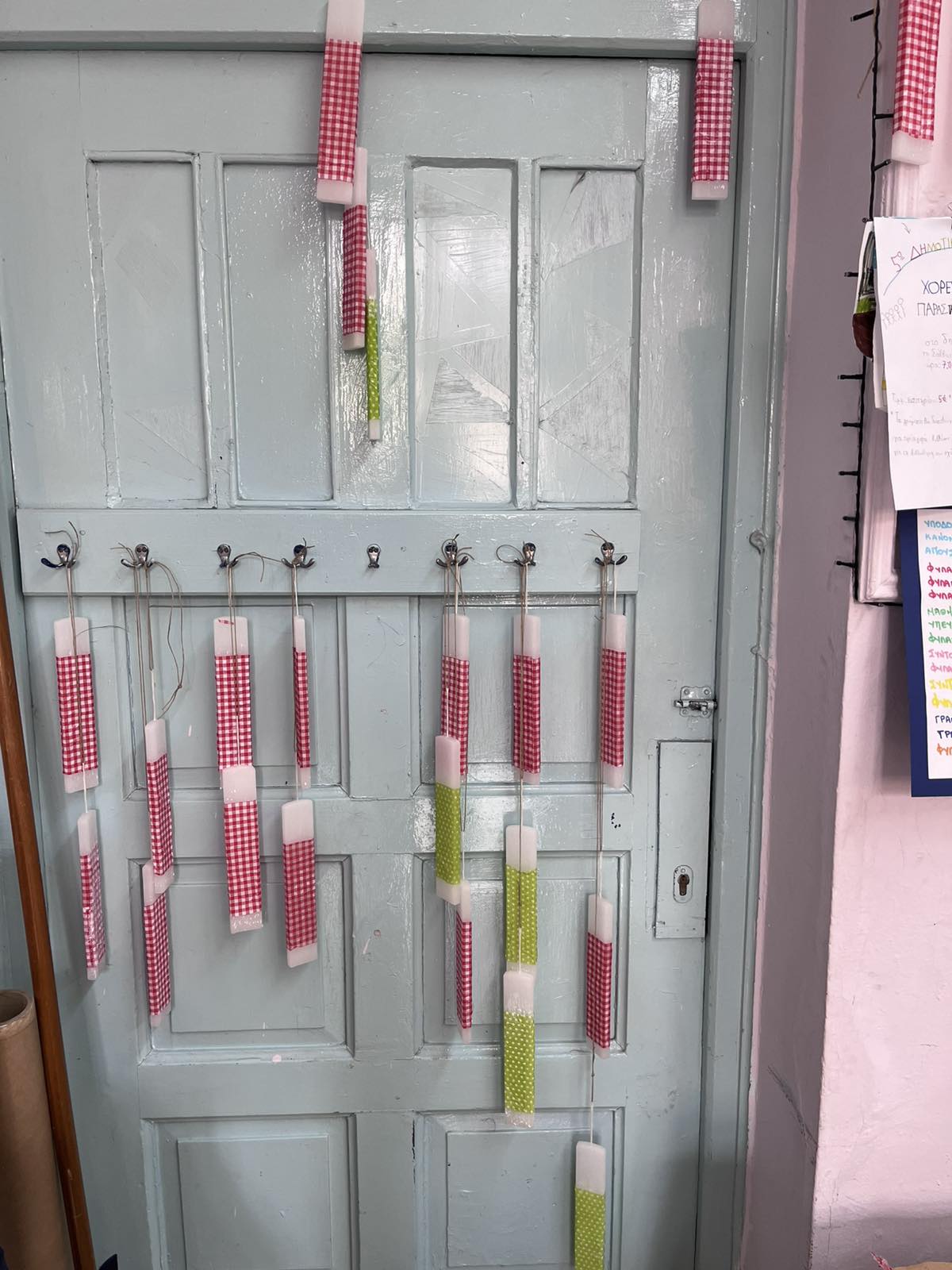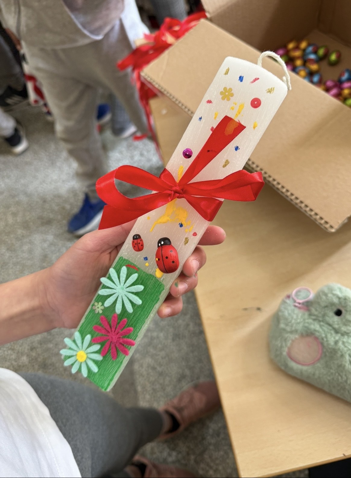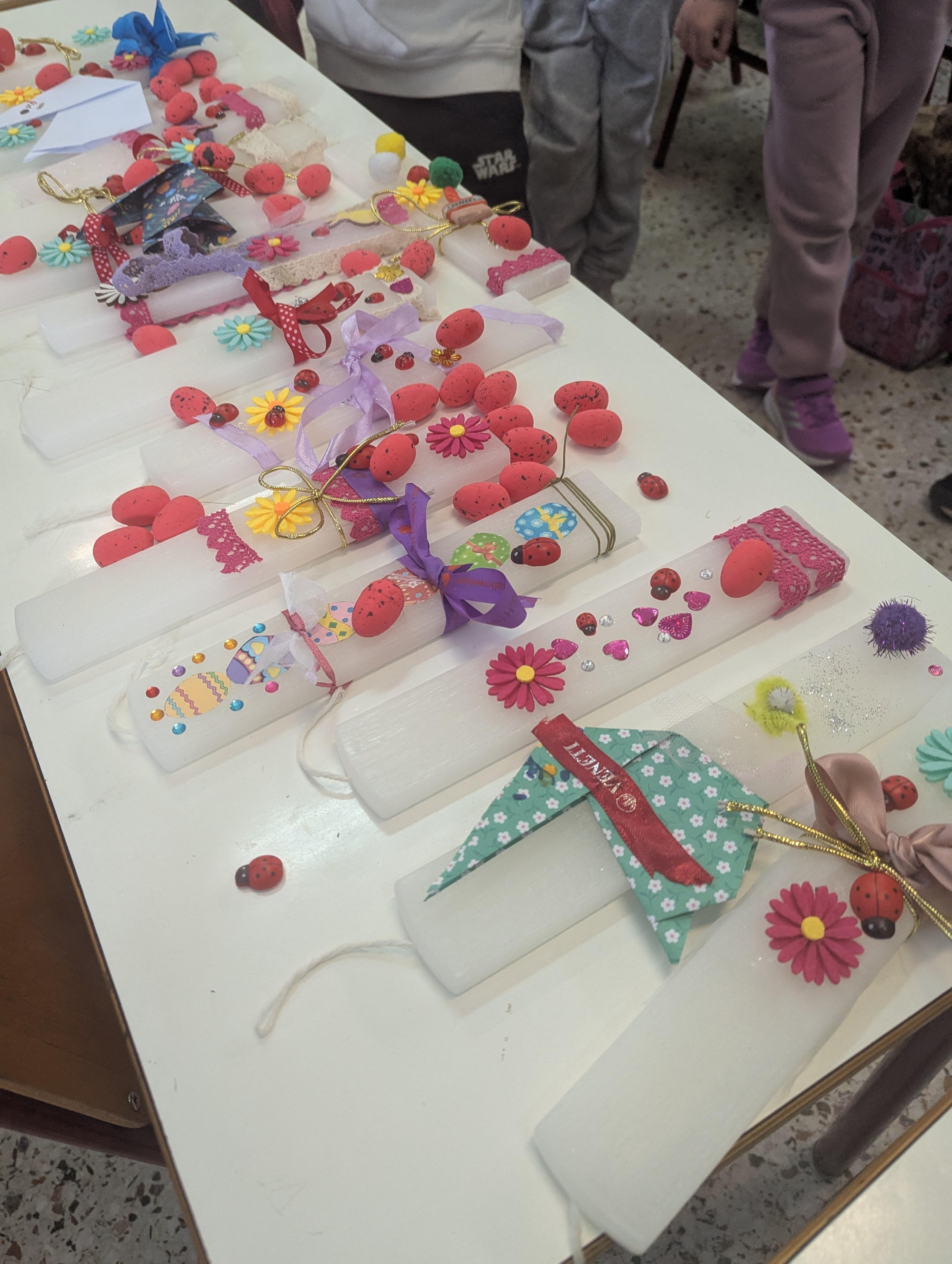 Ο Σύλλογος προσέφερε σε όλα τα παιδιά λευκές λαμπάδες και, με τη βοήθεια των δασκάλων τους, οι μαθητές είχαν την ευκαιρία να τις διακοσμήσουν με υλικά της επιλογής τους. Κορδέλες, κουμπιά, χάντρες, λουλούδια – όλα βρήκαν τη θέση τους πάνω στις λαμπάδες που έγιναν μοναδικά έργα τέχνης.
